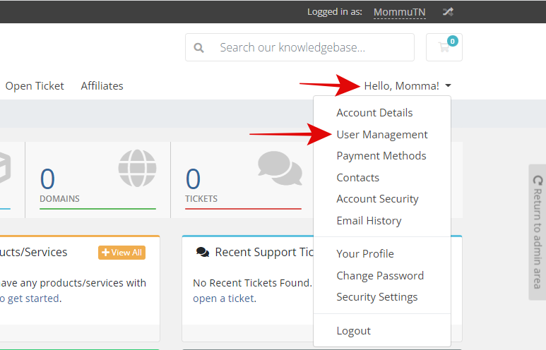 • Once you are logged into your client area, click on the account name in the top header (right-hand side) then click on User Management.