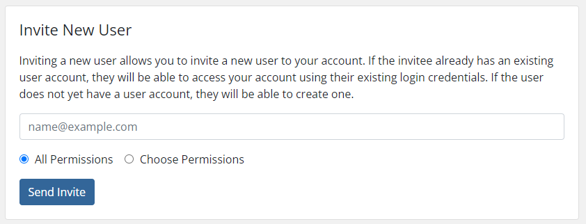 Inviting a new user allows you to invite a new user to your account. If the invitee already has an existing user account with us, they will be able to access your account using their existing login credentials. If the user does not yet have a user account, they will be able to create one.